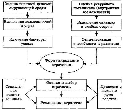Согласно этой модели процесс, стратегического планирования представляет собой некую точку пересечения выявленных возможностей и угроз внешней деловой среды, которые выражаются в форме ключевых факторов успеха, и сильных и слабых сторон ресурсного потенциала фирмы, выраженных в отличительных способностях к развитию.