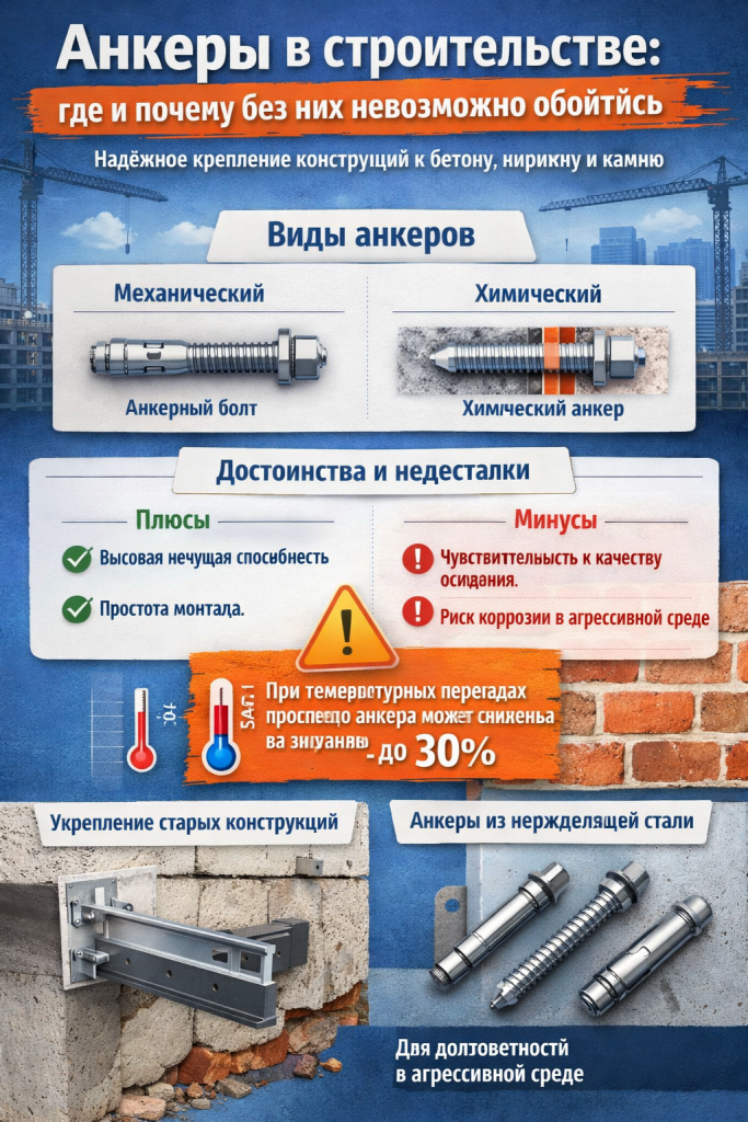 Дополнительно следует отметить, что анкеры активно применяются при модернизации и усилении существующих конструкций. С их помощью выполняется крепление дополнительных несущих элементов, усиление перекрытий и установка новых инженерных систем без демонтажа старых конструкций. Это особенно актуально при реконструкции зданий, где традиционные методы соединения оказываются технически или экономически нецелесообразными. Анкерные системы в таких случаях позволяют перераспределять нагрузки и повышать общую надёжность объекта.