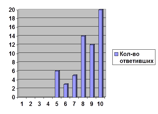 Нами был также задан последний вопрос: «Оцените, пожалуйста, уровень обслуживания в сети магазинов «Кора»? (по десяти бальной шкале), целью которого было выяснить, удовлетворяет ли потребителей уровень обслуживания в магазинах «Кора», так как сервисное поведение при организации розничной торговли играет существенное, если не первостепенное значение. Нами были получены следующие результаты представленные на рисунке 2.3.