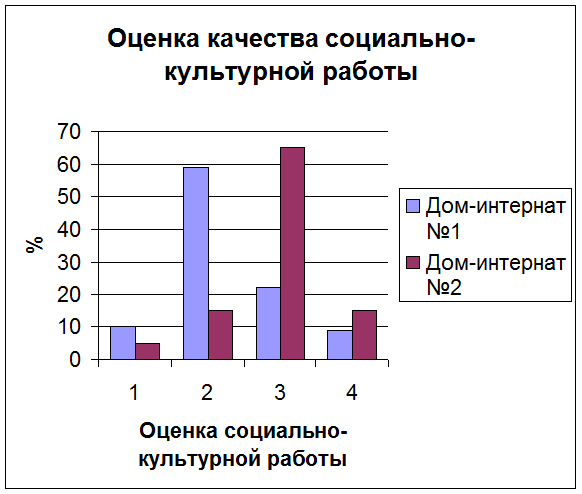Таким образом, мы видим, что в Доме-интернате №2 средние оценки качества социальной работы значительно выше. Это объясняется прежде всего тем, что в этом учреждении большая часть этой работы производилась руками самих проживающих, а персонал лишь направлял эту деятельность. В то же время в Доме-интернате №1, при больших, вероятно, относительных трудозатратах эффект от социально-культурной работы оказался значительно ниже.