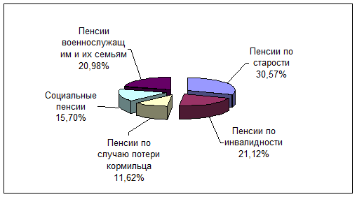 Результаты расчетов показали, что основной удельный вес в начисленных видах пенсий занимают пенсии по старости 30,57%, затем идут пенсии по инвалидности 21,12%, пенсии военнослужащим и их семьям составляют 20,98%, социальные пенсии составляют 15,7%, и самый наименьший удельный вес занимают пенсии по случаю потери кормильца 11,62% (Рисунок 8).
