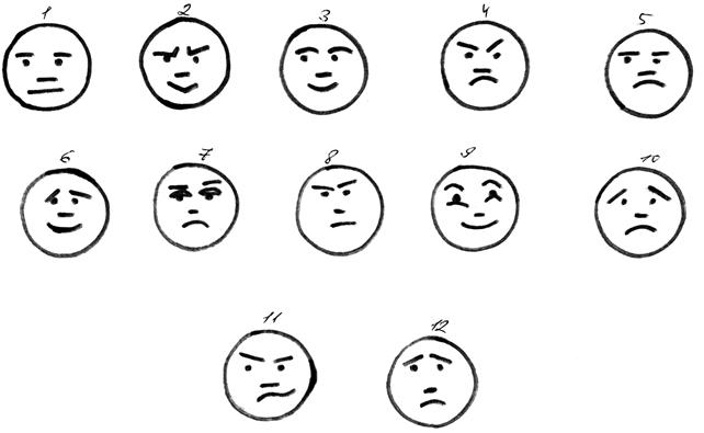 Организация обследования: Детям предъявляют поочередно карточки с изображением «рожиц». Экспериментатор просит детей определить «по выражению лица», что чувствует данный человечек. За каждый правильный ответ начисляется 1 балл. Всего карточек 12. Соответственно, количество баллов распределяется следующим образом: 12-9 - высокий уровень распознавания эмоций, 8-5 - средний уровень, 4-0 - низкий уровень.
