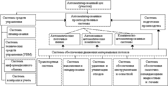 Автоматизированные участки (цехи) включают в себя автоматические поточные линии, автономные автоматические комплексы, автоматические транспортные системы, автоматические складские системы; автоматические системы контроля качества, автоматические системы управления и т.д. Примерная структура автоматизированного производственного подразделения приведена на рис.1.