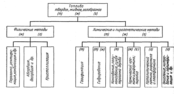 К химическим методам относятся методы пирогенетической переработки топлива, при которой физические процессы протекают при высокой температуре. Пирогенетическая переработка топлива включает пиролиз, гидрирование, газификацию и крекинг. На рис. 1.1 приведена схема переработки топлива.