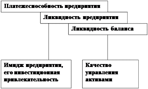 На рис.2. показана блок-схема, отражающая взаимосвязь между платежеспособностью, ликвидностью предприятия и ликвидностью баланса, которую можно сравнить с многоэтажным зданием, где все этажи равнозначны, второй этаж нельзя возвести без первого, а третий без первого и второго. Если рухнет первый, то и все остальные развалятся. Следовательно, ликвидность баланса является основой (фундаментом) ликвидности и платежеспособности предприятия. Иными словами ликвидность – это способ поддержания платежеспособности. Но в то же время, если предприятие имеет высокий имидж и постоянно является платежеспособным, то ему легче будет поддерживать свою ликвидность.