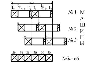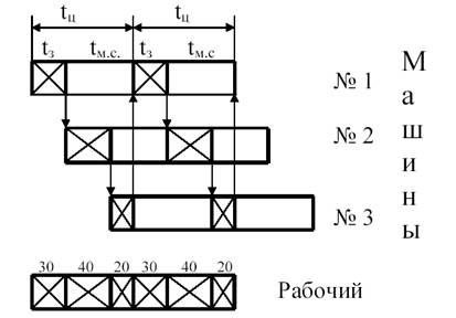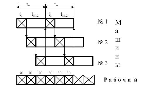 Пусть процесс на машинах № 1, 2, 3 (рис. 1) протекает так, что после 30 сек, затрачиваемых рабочим на выполнение определённого вида работ на одной машине (это время обозначим tз) следует 60 сек, в течении которых машина способна выпускать продукцию без участия работника. Это последнее время будем называть свободным машинным временем и обозначим tм.с. Примем также, что указанное чередование времени на выполнение рабочих приёмов работником и свободного машинного времени в дальнейшем повторяется строго в той же последовательности. Такой процесс называют циклическим. При заданных условиях рабочий, закончив выполнять рабочие приёмы на машине № 1, может перейти к машине № 2, а затем к № 3 и, затратив на них также по 30 сек, возвратиться к машине № 1 в тот момент, когда на ней закончится свободное машинное время. Те 60 сек, в течение которых каждая машина действует самостоятельно, рабочий может использовать на выполнение работы на двух других машинах.