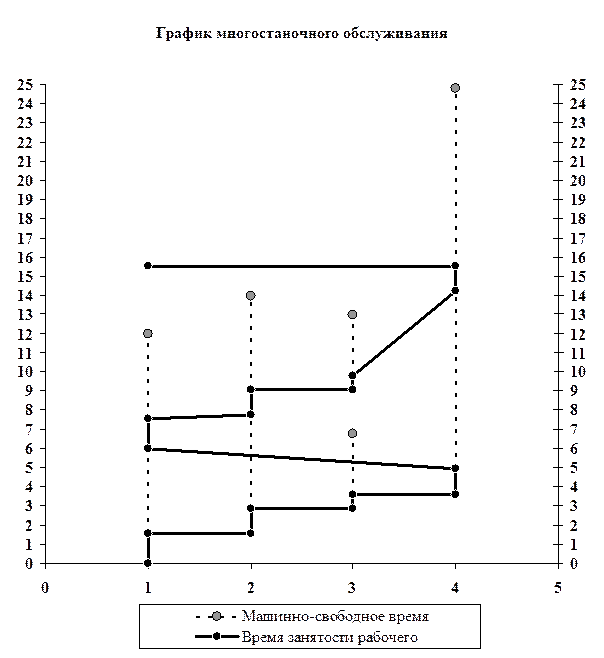 Из рис. 3 видно, что перерывов из-за совпадения можно избежать, если поручить рабочему работать на двух машинах, однако в этом случае не будет полностью использовано рабочее время многостаночника.