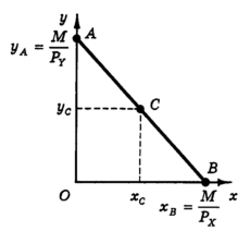 Координаты точек А и В (точки пересечения бюджетной линии с осями координат) характеризуют максимальные количества товаров Х и Y, которые может приобрести потребитель, истратив весь свой доход только на товар Х или только на товар Y. Любой другой находящийся на бюджетной линии набор товаров С = (xc, yc) имеет для потребителя точно такую же стоимость М, что и наборы А = (0, М/РY) и В = (М/РX, 0). Т.е., бюджетная линия - это геометрическое место точек, характеризующих все наборы товаров, которые может приобрести потребитель, полностью израсходовав свой доход М при данных ценах товаров РX и РY.