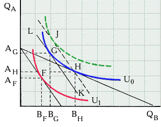 Пусть при прочих равных условиях цена блага B возросла. В результате этого увеличиться наклон бюджетной линии и равновесие потребителя будет представлять точка F. Потребителю пришлось заменить набор AH , BH менее предпочтительным набором AF , BF, содержащим меньшее количество обоих благ; в этом состоит общий эффект снижения цены.