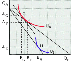 Исходное равновесное состояние потребителя соответствует точке F. Повышение цены блага B увеличивает наклон бюджетной линии, и потребитель оказывается на более низкой кривой безразличия U1. Смещение более низких кривых безразличия к оси абсцисс отражает увеличивающееся предпочтение “некачественного” блага по мере снижения благосостояния потребителя.