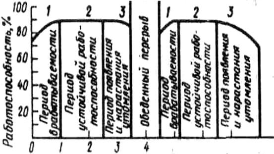 В течение рабочего дня работоспособность характеризуется тремя периодами: 1) рабочий "входит" в работу (период врабатываемости), постепенно растет производительность его труда;