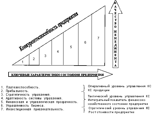 Взаимосвязь выявленных ключевых характеристик состояния предприятия с его конкурентоспособностью и качеством менеджмента представлена на рисунке 1.
