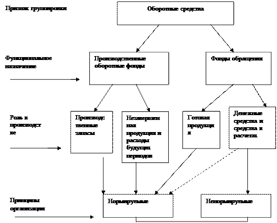 Пунктирная линия от блока "Денежные средства и средства в расчетах» к блоку "Нормируемые оборотные средства" означает следующее в различных странах движение денежных потоков отслеживается столь тщательно, что платежные календари соблюдаются почти со 100-процентной точностью, это позволяет относить указанные средства в сферу нормируемых В Российской Федерации тип денежные средства и средства в расчетах с такой точностью нормировать сложно из-за нестабильности ситуации, срывов в расчетах и т д.