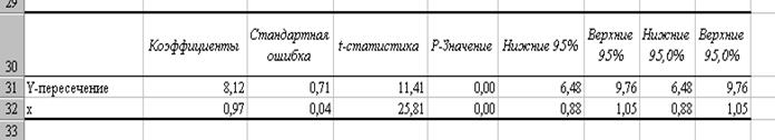 Расчет параметров линейного уравнения множественной регрессии с полным перечнем факторов проводиться с помощью инструмента анализа данных Регрессия:
