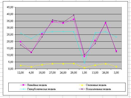 Сравнив модели по данным характеристикам можно сделать вывод, самое большее значение F-критерия Фишера и большое значение коэффициента детерминации R2 имеет линейная модель, но т.к. у нее самая маленькая Eотн., то лучшей для построения прогнозов является показательная модель.