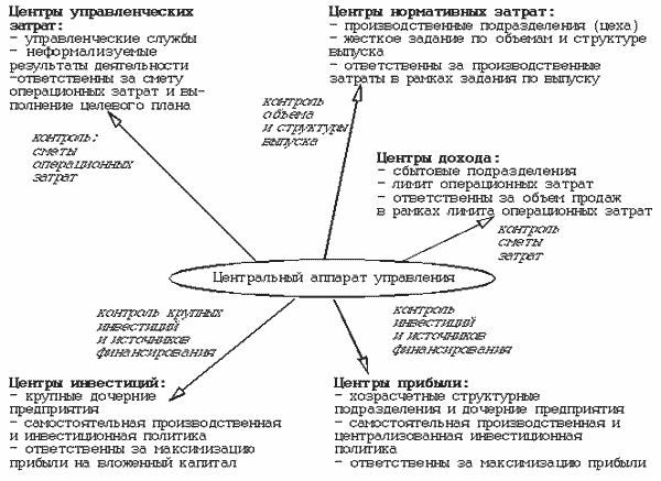 Заметим, что различные подразделения (центры ответственности) на предприятии различаются по своей «степени свободы», то есть по полномочиям руководителей структурных подразделений в своей оперативной работе. Так, начальник производственного цеха, как правило, имеет право самостоятельно определять величину и структуру удельных затрат по выпуску тех или иных видов продукции, в то время как сама структура и величина выпуска устанавливаются и жестко контролируются аппаратом управления в лице планово-экономического управления (ПЭУ). Если же цех переводится на хозрасчет (это бывает в тех случаях, когда функции цеха полностью охватывают весь производственный цикл по тому или иному виду продукции), то полномочия руководителя существенно расширяются. Он получает право в определенных пределах самостоятельно устанавливать объемы выпуска, а оценочным показателем деятельности цеха уже будет не уровень удельных затрат, а расчетная прибыль, определяемая как разница расчетной выручки по выпущенной продукции и величины фактической себестоимости выпуска.