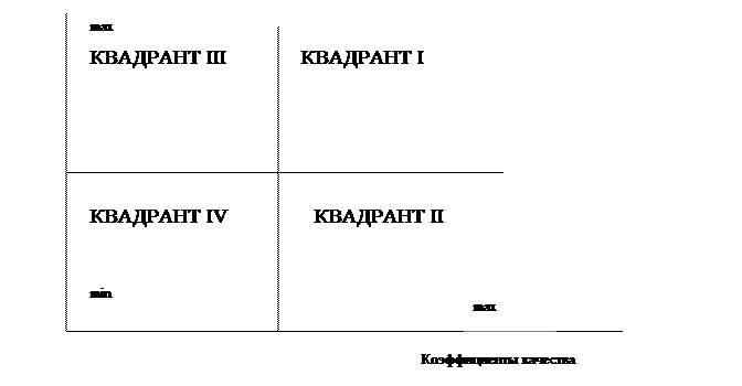 Презентация результатов исследования производится графически (рис. 2): на оси абсцисс откладываются фактически полученные значения коэффициентов качества, на оси ординат - фактическая важность критериев качества услуги. Две оси делят результаты опроса на четыре равных квадранта, которые дают информацию для принятия стратегических решений по совершенствованию качества: квадранты I и II указывают на положительное состояние дел, а квадрант III - на наличие серьёзных проблем [2].