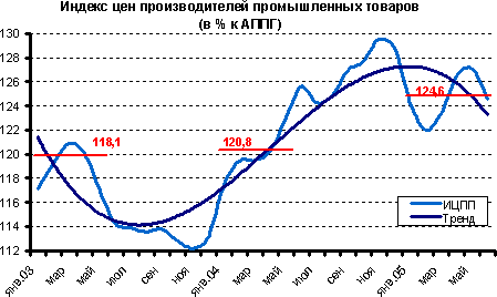 Прирост индекса цен производителей промышленных товаров в июне 2005 г., по данным Росстата, составил 0,1% по отношению к предыдущему месяцу (2,8% в июне 2004 г.). С начала года увеличение составило 9,8% и (16,7%).