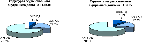 Согласно данным Минфина России, государственный внутренний долг федерального правительства РФ, по состоянию на 1 августа 2005 г. составил 819,827 млрд. руб. Таким образом, внутренний долг с начала года увеличился 63,037 млрд. руб. или 8,3%. В аналогичном периоде предыдущего года внутренний долг федерального правительства увеличился на 50,949 млрд. руб. или 7,7%. Как в абсолютном, так и в относительном выражении наибольший прирост обязательств сложился в секторе облигаций федерального займа с постоянным купонным доходом (ОФЗ-ПД) – 56,642 млрд. руб. или 130,8%, таким образом, объем долга, выраженный данной бумагой составил на начало августа т.г. 99,949 млрд. руб. При этом, объем обязательств в виде ОФЗ с фиксированным доходом (ОФЗ-ФК) снизился с начала года на 26,093 млрд. руб. или 15,2% и составил 145,131 млрд. руб. Обязательства в виде наиболее популярной в настоящее время бумаги с амортизацией основной суммы (ОФЗ-АД) возросли на 32,487 млрд. руб. (5,9%) – до 574,722 млрд. руб.