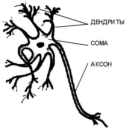Нейроны крайне разнообразны по форме, которая зависит от их местонахождения в нервной системе и особенностей фунционирования. На Рис. 1. приведена схема строения "типичного" нейрона. Тело клетки содержит множество ветвящихся отростков двух типов. Отростки первого типа, называемые дендритами за их сходство с кроной раскидистого дерева, служат в качестве входных каналов для нервных импульсов от других нейронов. Эти импульсы поступают в сому или тело клетки размером от 3 до 100 микрон, вызывая ее специфическое возбуждение, которое затем распространяется по выводному отростку второго типа - аксону. Длина аксонов обычно заметно превосходит размеры дентритов, в отдельных случаях достигая десятков сантиметров и даже метров. Гигантский аксон кальмара имеет толщину около миллиметра, и именно наблюдение за ним послужило выяснению механизма передачи нервных импульсов между нейронами[1].