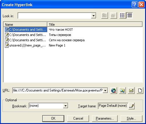 Чтобы вставить гиперссылку, нужно выделить фрагмент текста и из меню Front Page выбрать пункт Insert > Hyperlink.
