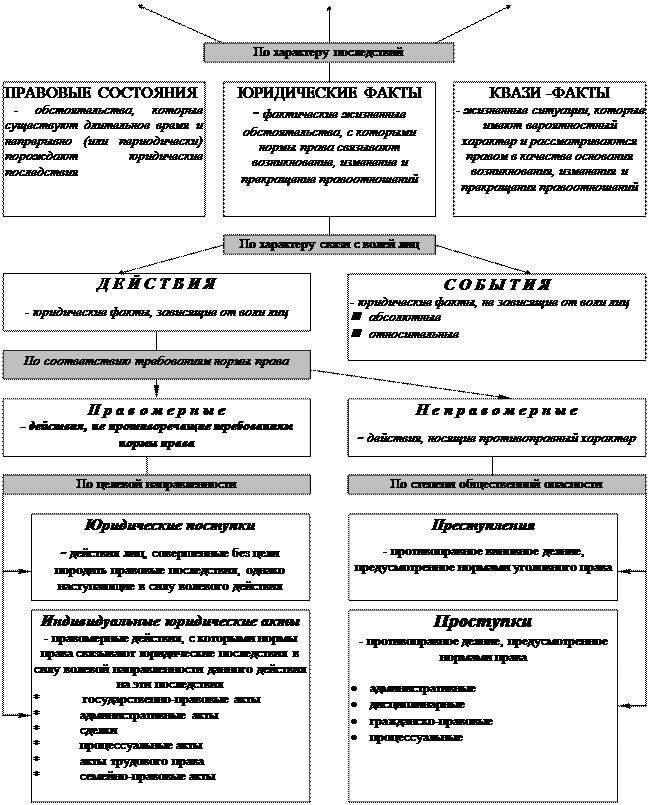 Несмотря на известную условность данного деления (поскольку один и тот же факт может в зависимости от особенностей тех или иных отношений приводить к наступлению различных последствий), оно в теоретическом отношении позволяет раскрыть конкретную функцию соответствующего факта в механизме правового регулирования, а в практическом - определить его значение для наступления тех или иных правовых последствий.