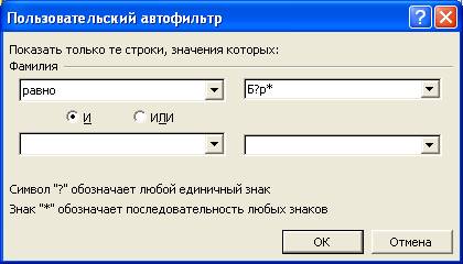 Из меню автофильтра для столбца Фамилия выберем пункт Условие и зададим следующие параметры: