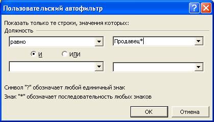 Для столбца Должность из меню автофильтра выберем пункт Условие и зададим следующее условие: