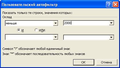 В строку ниже вставленных заголовков столбцов, для столбца Должность введем продавец ? кат., а для столбца Оклад - <2000.