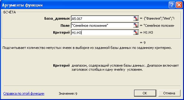 В результате в ячейку H70 будет введена формула: =БСЧЁТА(A5:I67;"Семейное положение";H1:H3).