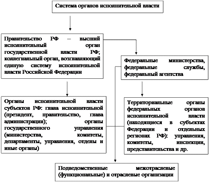 Под системой органов исполнительной власти понимается вертикальная связь между соподчиненными органами на основе разделения компетенции между ними. В систему входят (см. схему 1):