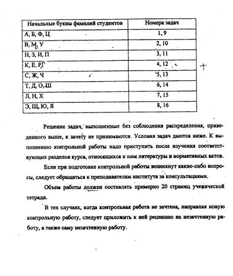 По курсу "Правоведение" студент должен написать одну контрольную работу и решить в ней две задачи: одну по основам теории права, конституционному и гражданскому праву и одну по трудовому праву. Каждая задача посвящена определенной теме, указанной после номера задачи.