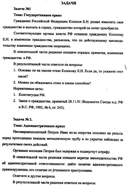 Обосновывая решение нормативными актами, ни в коем случае не следует-ограничиваться одним цитированием этих актов или изложением их содержания. Решения задач должны иметь правильные выводы, сделанные самим студентом на основании нормативных актов применительно к правоотношениям, предусмотренным условиями задач.