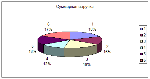 Таким образом, получается, доля суммарной выручки магазина 1 в общем объеме суммарной выручки составляет 18%, доля суммарной выручки магазина 2 в общем объеме суммарной выручки составляет 16%, доля суммарной выручки магазина 3 - 19%, доля суммарной выручки магазина 4 - 12%, доля суммарной выручки магазина 5 - 18%, доля суммарной выручки магазина 6 - 17% (Табл. 1).