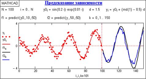 Ø predict(Y,n,K), где n – степень полинома аппроксимации вектора равномерно распределенных данных Y, позволяет вычислить вектор К точек предсказания (экстраполяции) поведения произвольного сигнала за пределами его задания (по возрастанию координат х). Предсказание тем точнее, чем более гладкую форму имеет заданный сигнал. Пример использования функции приведен на рис. 2.5.1 для гладкой и статистически зашумленной сигнальной кривой. Степень аппроксимирующего полинома определяет глубину использования входных данных и может быть достаточно небольшой для гладких и монотонных сигналов. Ошибка прогнозирования увеличивается по мере удаления от заданных данных.