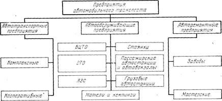Работоспособность подвижного состава обеспечивают различные предприятия автомобильного транспорта, предназначенные, в частности, для ТО, ремонта, хранения автомобилей и обеспечения их эксплуатационными материалами. В зависимости от выполняемых функций эти предприятия подразделяются на автотранспортные, авто обслуживающие и авторемонтные (рис. 1.1).