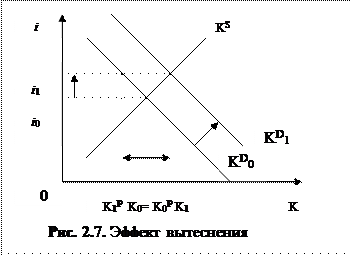 Механизм эффекта вытеснения проявляется следующим образом. Сдвиг линии спроса на кредит приводит к повышению процентной ставки. И хотя общий спрос (как государственный, так и частный) на кредит возрос до положения К1, но спрос на кредит частного сектора (К1Р) при возросшей ставке процента снизился.