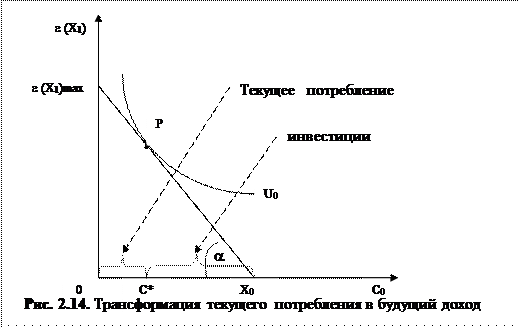 Итак, наклон линии бюджетного ограничения определяет величину ставки процента. Для того, чтобы определить величину инвестиций (а значит, и кредита), вооружимся постулатом Бём-Баверка, согласно которому, текущее потребление имеет более высокую полезность, чем потребление будущее. На рис. 2.14 это выражено при помощи линии кривой безразличия U0. Оптимальное потребление равно величине 0 – С*, а оптимальные инвестиции величине х0 – С*.