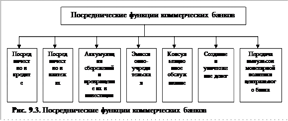 Банки выполняют следующие функции: 1) посредничество в кредите; 2) посредничество в платежах; 3) мобилизация сбережений и денежных доходов с их последующим превращением в капитал; 4) создание кредитных орудий обращения (банкноты, чеки и др.), облегчающих оборот и сокращающих издержки обращения (см. рис. 9.3).