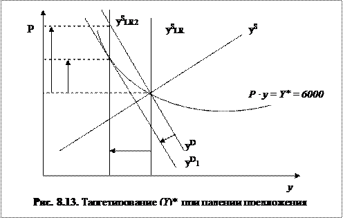 На графике 8.11 эти, и другие комбинации уровня цен и номинального дохода изображены с помощью гиперболы. Допустим, объем естественного уровня производства страны изображен с помощью долгосрочной линии предложения ySLR. Линия же краткосрочного предложения – yS, а линия спроса – yD.