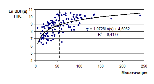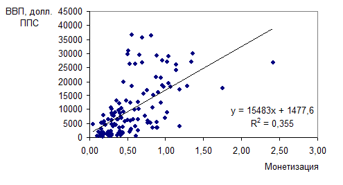 При использовании ВВП на душу населения в паритетных ценах наблюдается более тесная связь с монетизацией. Поэтому далее будем опираться именно на эти данные.