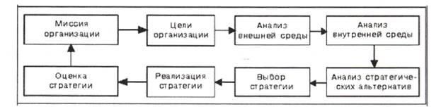 О. Виханский [8, c.110] процесс стратегического управления рассматривает, как динамическую совокупность пяти взаимоувязанных управленческих процессов: анализ среды; определение миссии и целей; выбор и выполнение стратегии, оценка и контроль реализации.