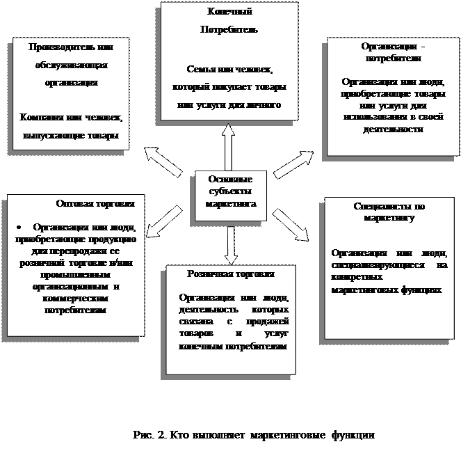 Субъекты маркетинга включают производителей и организации обслуживания, оптовые и розничные торговые организации, специалистов по маркетингу и различных потребителей. Как показано на рисунке 2, у каждого из них своя роль. Важно отметить, что хотя ответственность за выполнение маркетинговых функций может делегироваться и распределяться различными способами, совсем ими в большинстве случаев пренебречь нельзя, они должны обязательно кем-то выполняться.