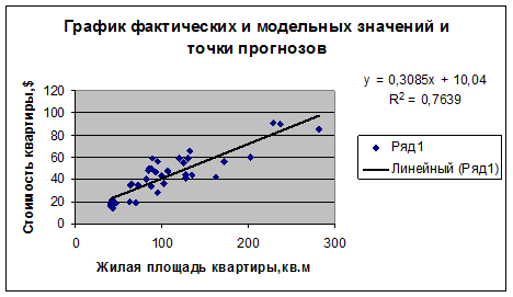 5. Для выбранной модели осуществить прогнозирование среднего значения показателя Y при уровне значимости α = 0,05, если прогнозное значение фактора Y составит 80% от его максимального значения. Представить графически: фактические и модельные значения, точки прогноза.