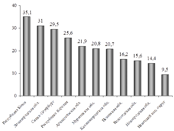 Общим для всех регионов является заметный рост доходного потенциала и сохранение различий между максимальной и минимальной величинам. В регионах Северного района, без учета Ненецкого национального округа, в 2004 г. по сравнению с 2000 г. они сократились с 2,1 до 1,3 раза. В регионах Северо-Запада различия между максимальной и минимальной величинам сохранились на уровне 2000 г. – 2 раза.