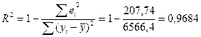 5. Вычислить коэффициент детерминации, проверить значимость уравнения регрессии с помощью F-критерия Фишера (a = 0,05), найти среднюю относительную ошибку аппроксимации. Сделать вывод о качестве модели.