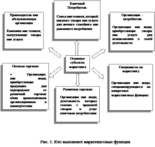 Субъекты маркетинга включают производителей и организации обслуживания, оптовые и розничные торговые организации, специалистов по маркетингу и различных потребителей. Как показано на рисунке 2, у каждого из них своя роль. Важно отметить, что хотя ответственность за выполнение маркетинговых функций может делегироваться и распределяться различными способами, совсем ими в большинстве случаев пренебречь нельзя, они должны обязательно кем-то выполняться.