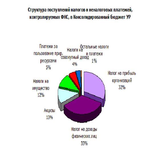 Доходная часть консолидированного бюджета УР (см. рис. 3. 4), контролируемая ФНС, была сформирована следующими налоговыми доходами: поступления налога на доходы физических лиц составил 2 463,2 млн. р. (34,3% в общем объеме доходов), налога на прибыль организации – 2 277,1 млн. р. (31,7%), акцизов – 914,9 млн. р. (12,8%).