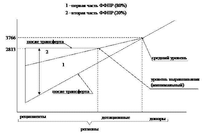 Финансовая поддержка из федерального бюджета должна, как уже отмечалось, выравнивать удельные бюджетные расходы, то есть подтягивать бедные регионы по уровню расходов к среднероссийскому уровню. Очевидно, что такое выравнивание не должно резко улучшать финансового положения одних регионов (по отношению к другим), так как в этом случае у региона исчезает стимул к зарабатыванию средств. Не должно выравнивание приводить и к ухудшению положения региона (относительно других регионов), так как это снизит стимулы увеличения собственных доходов, что недопустимо.