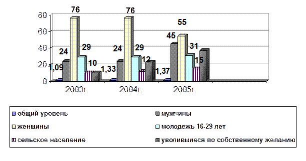 Уровень регистрируемой безработицы в ЦЗН Менделеевского района на 01.01.2006 г. составил 1,5% от численности экономически активного населения. Из рис. 3.1 видно, что в Менделеевском районе уровень регистрируемой безработицы повышается из-за повышенного процента незанятого населения по причине уволившихся по собственному желанию, в основном из-за низкого уровня заработной платы, а также по причине высвобождаемости работников.